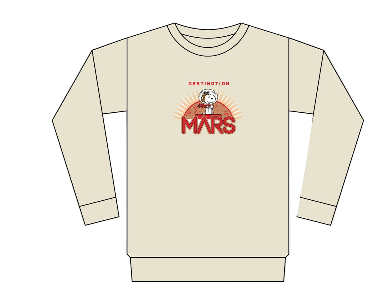 Blast off into style with this playful Snoopy Destination Mars Crewneck! Featuring everyone's favorite beagle on an intergalactic adventure, this cozy pullover brings a touch of cosmic fun to your everyday wardrobe. Perfect for Peanuts fans and space enthusiasts alike, it's the ideal way to show your love for classic characters with a modern twist. Soft, comfortable, and ready for any mission—whether you're exploring the galaxy or just hanging out on Earth, this crewneck keeps you looking out of this world.