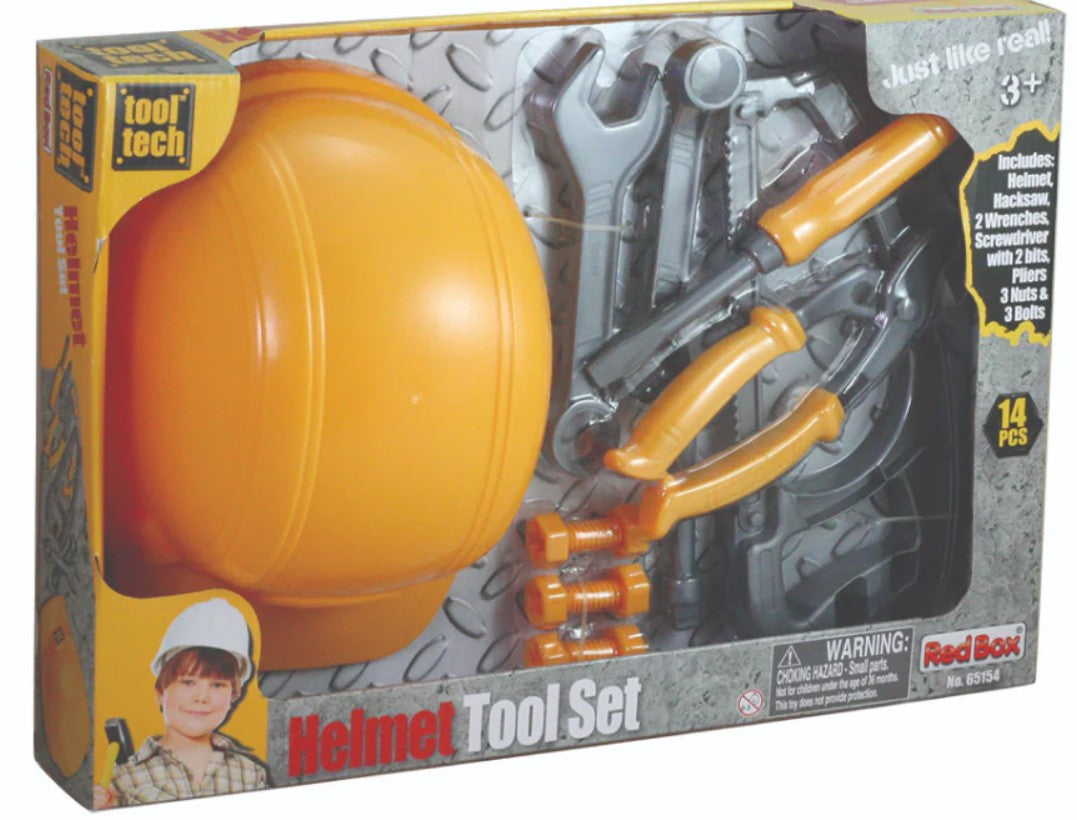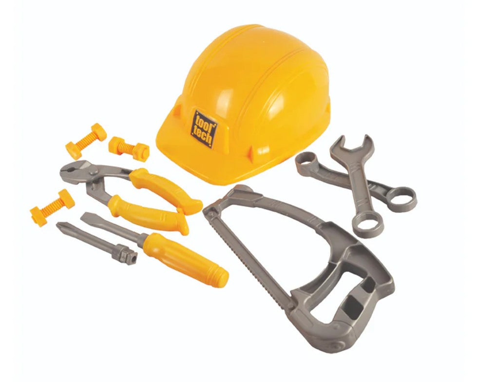 Little builders will love this realistic set which features five durable plastic tools plus nuts and bolts and an adjustable pretend hard hat!